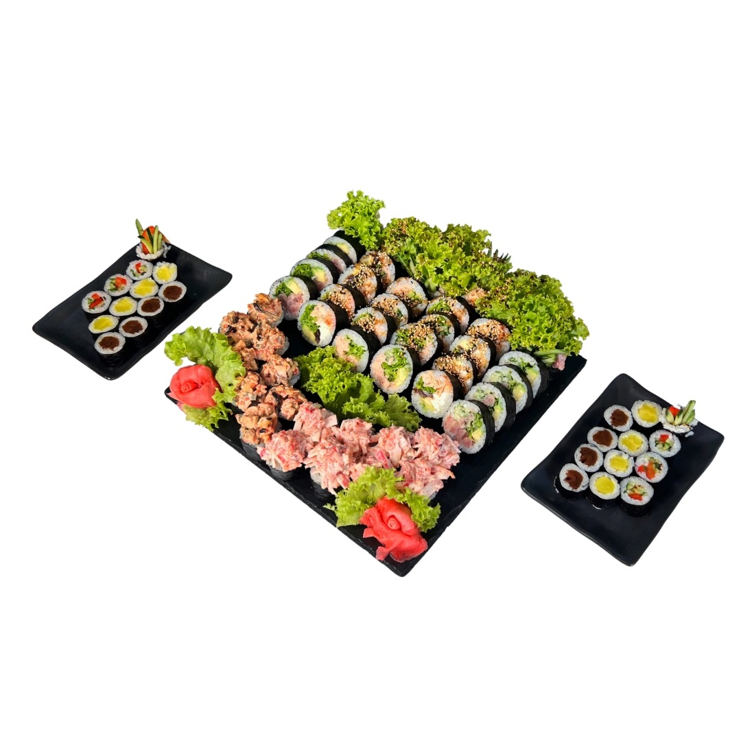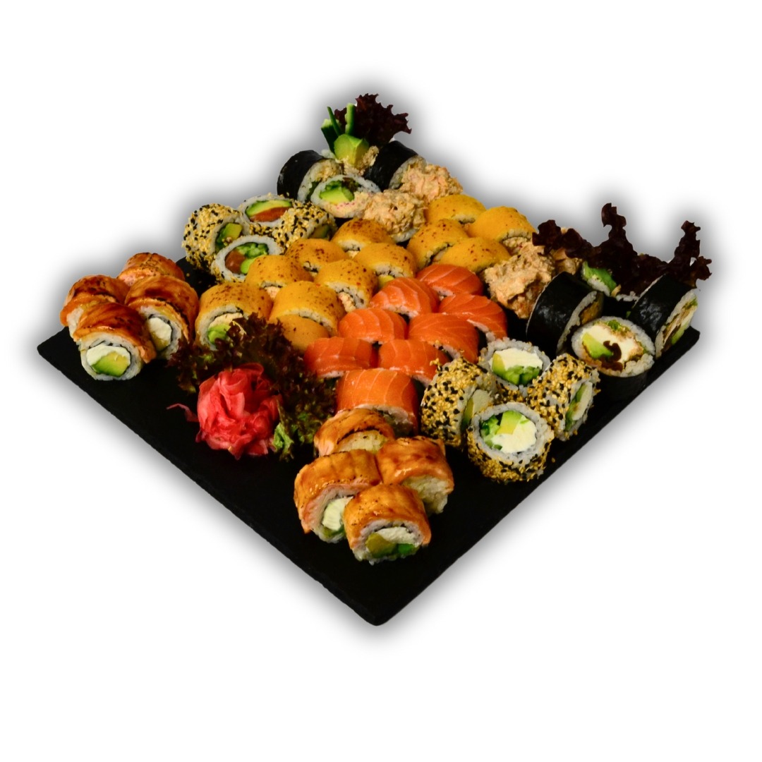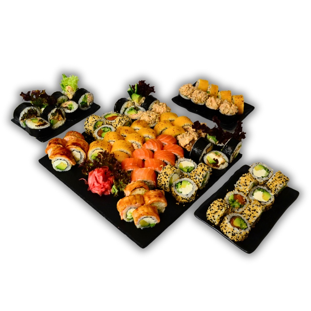 12x Futomaki surimi mix / 10x Filadelfia łosoś / 10x Opalany łosoś / 12x Futomaki Special / 10x California Vege / 10x Opalany ser z grillowanym lososiem/ 8x Uramaki Special 10x Opalony ser z wedzonym kurczakiem / 10x California łosoś